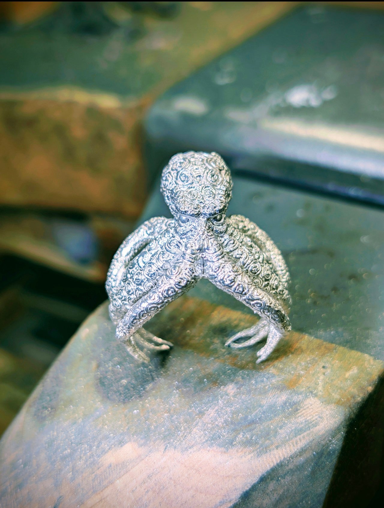 With a striking oxidized and polished finish, the ring's darker recesses highlight the meticulous carving, giving it a sense of ancient, ocean-floor mystery. The way the tentacles hold the finger allows for a slightly adjustable fit, ensuring both comfort and a secure fit, just like the kraken's legendary embrace. This isn't just a ring—it's a wearable piece of oceanic lore.