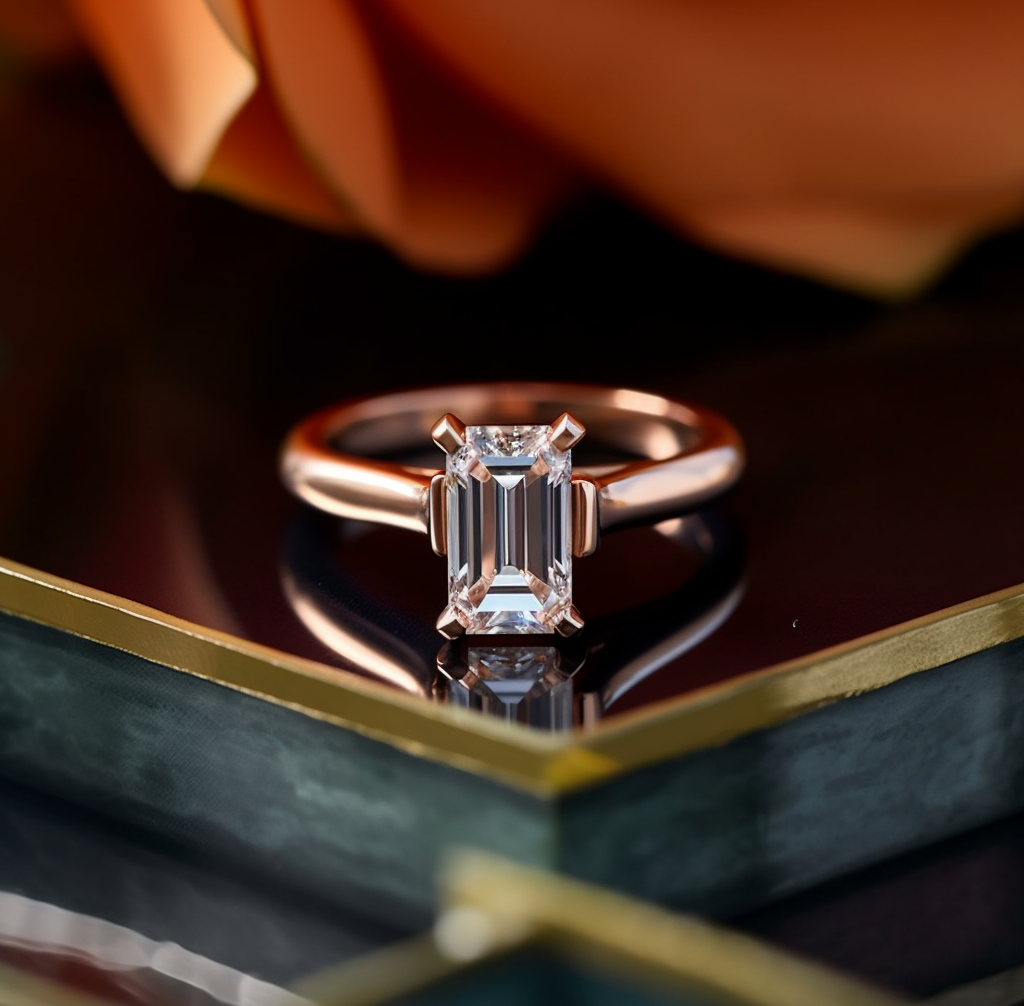 A contemporary 4 claw set emerald cut solitaire diamond engagement ring.