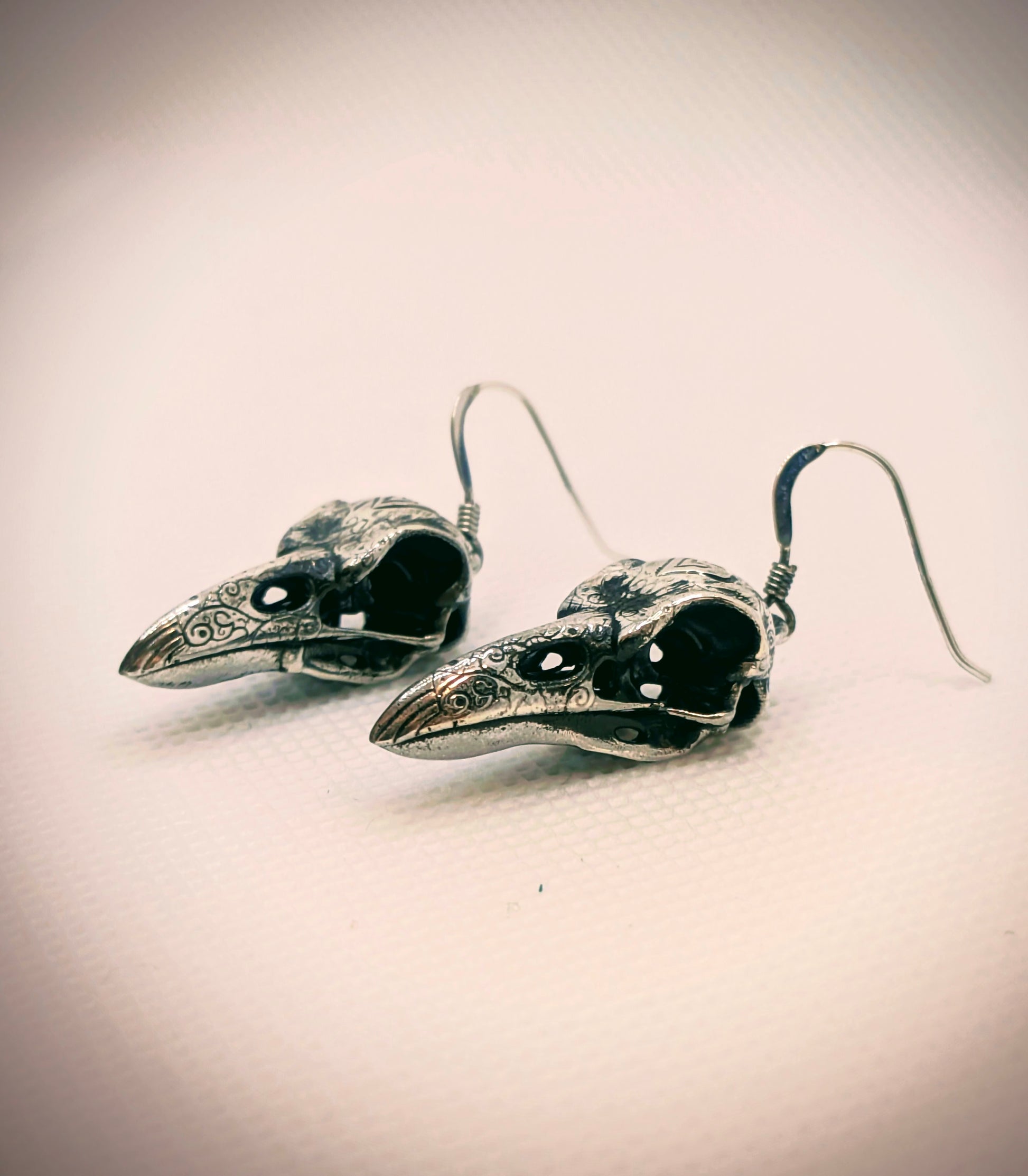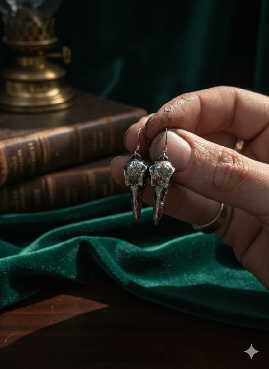Crafted from sterling silver with an antiqued finish to highlight every fine detail, 'The Pallas Perch' earrings are a striking and elegant tribute to Edgar Allan Poe's "The Raven." Each earring is a meticulously sculpted raven skull, capturing the alluring texture of bone and the delicate curve of the beak. Intricate carvings adorn the surface, featuring patterns reminiscent of forgotten lore and the shadowy depths of the poem's atmosphere.